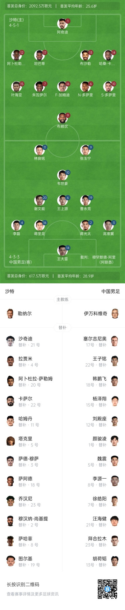 3月21日訊 世預賽亞洲區(qū)第三階段C組第7輪,中國男足客場挑戰(zhàn)沙特,賽前首發(fā)名單公布。