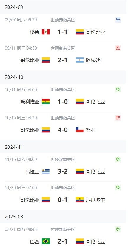 哥倫比亞在世預(yù)賽已經(jīng)遭遇3連敗,而在其美洲杯決賽不敵阿根廷之后,球隊在近7場比賽只取得2勝1平4負(fù)。具體戰(zhàn)績?nèi)缦拢?/p>