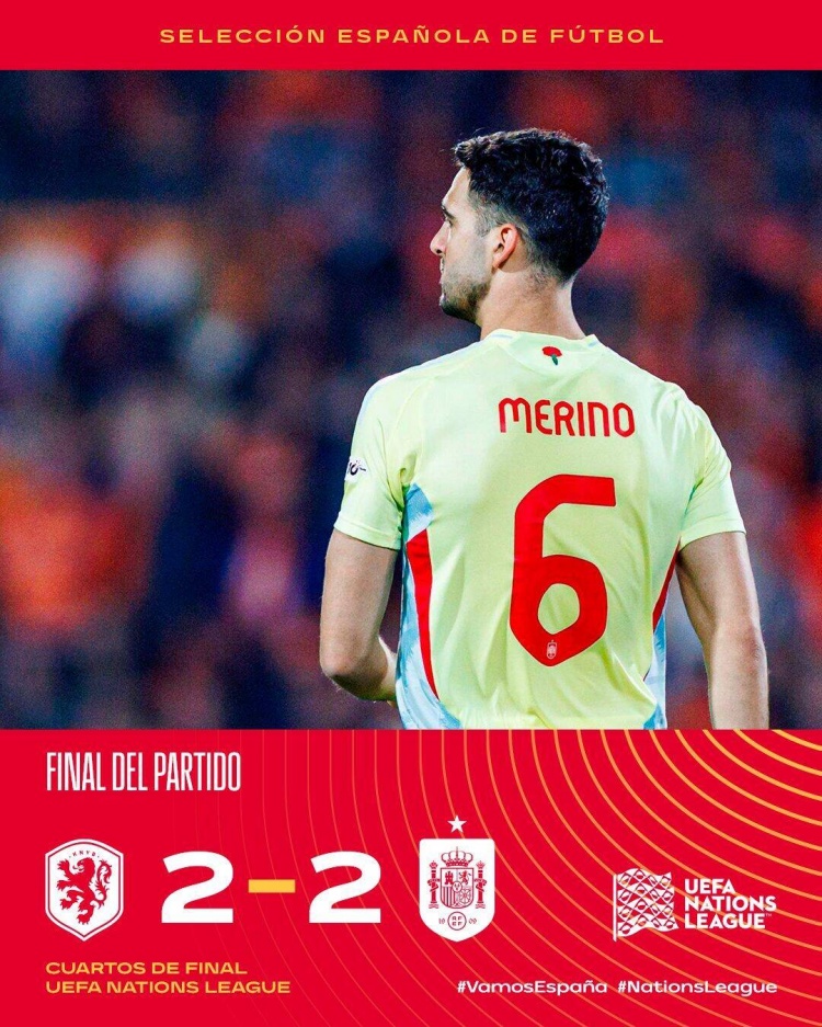 梅里諾補(bǔ)時(shí)絕平,荷蘭2-2西班牙,西班牙歐國(guó)聯(lián)五連勝終結(jié)。