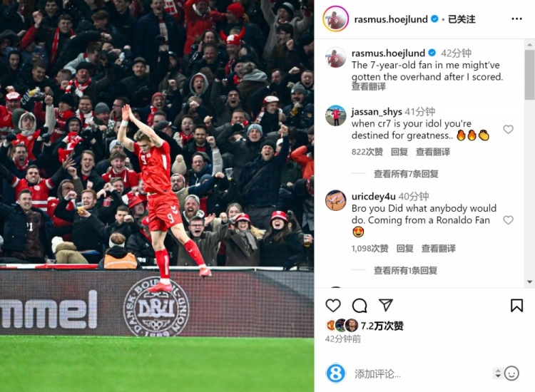 霍伊倫在社交媒體上曬出自己慶祝的照片,配文:“藏在我心里的那個(gè)7歲小球迷,進(jìn)球后可能接管了我?!?/p>