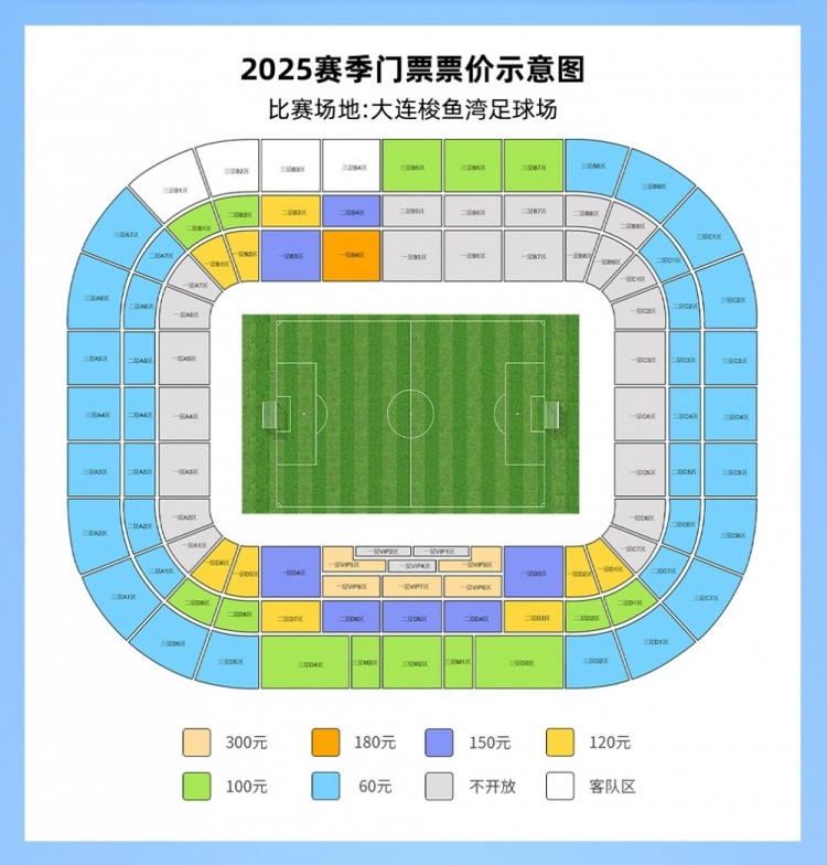本賽季,大連英博的主場(chǎng)仍是梭魚灣足球場(chǎng)。俱樂(lè)部將主場(chǎng)看臺(tái)散票劃分為6個(gè)區(qū)域,每個(gè)區(qū)域票價(jià)不同,分別為60元、100元、120元、150元、180元和300元。