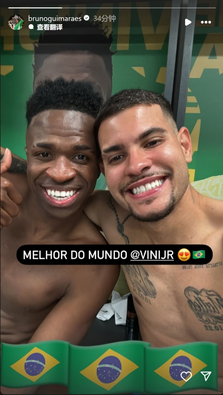 吉馬良斯社媒曬出與絕殺功臣維尼修斯的合照,并配文:“世界最佳,維尼修斯?!?/p>
