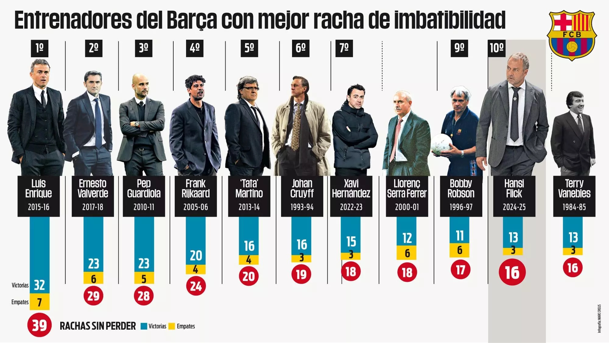 弗里克目前率巴薩連續(xù)16場不敗排隊史第10,第1是恩里克的39場