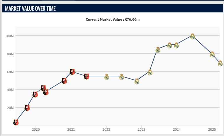 昨日德轉(zhuǎn)更新西甲球員身價,22歲的皇馬中場卡馬文加再降1000萬,最新身價為7000萬歐。