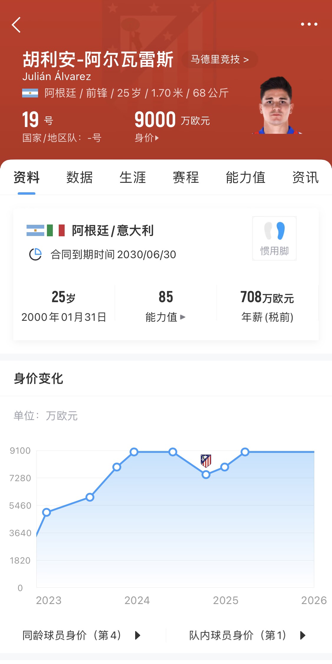 03月22日訊 昨日德轉更新西甲球員身價,阿爾瓦雷斯的身價重新回到9000萬歐,但沒有破億。