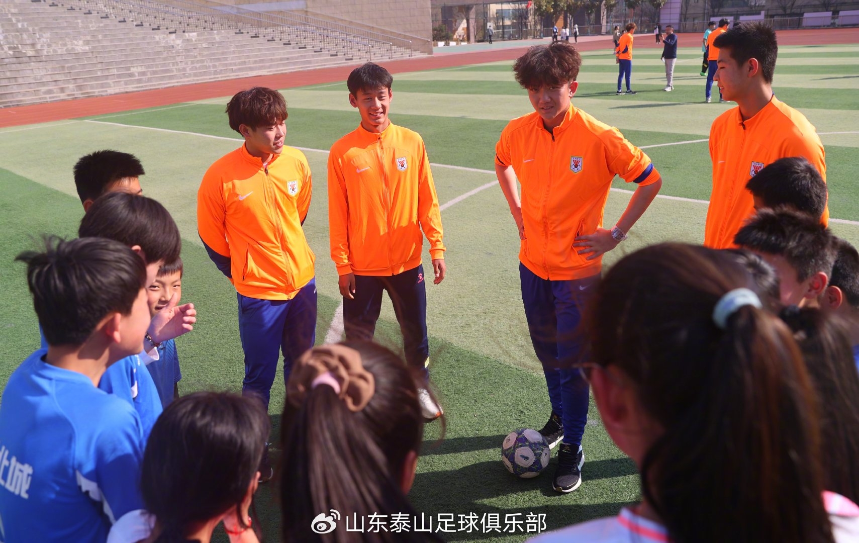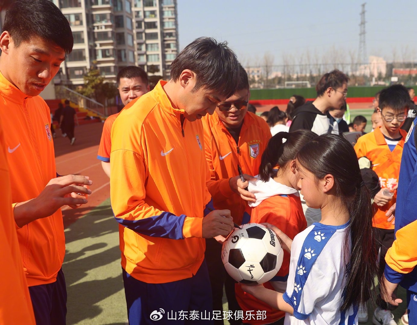 活動中,山東泰山足球俱樂部向?qū)W校及臨沭縣體育部門捐贈了簽名足球、簽名球衣、守門員手套及專業(yè)足球訓(xùn)練裝備等物資,山東省體育記者協(xié)會體育記者足球聯(lián)隊(duì)也向?qū)W校捐贈了學(xué)習(xí)用品和足球裝備。隨后,俱樂部球員們給學(xué)生們進(jìn)行了足球基礎(chǔ)技能培訓(xùn),并組織了趣味足球游戲,讓孩子們在歡聲笑語中感受足球的魅力。