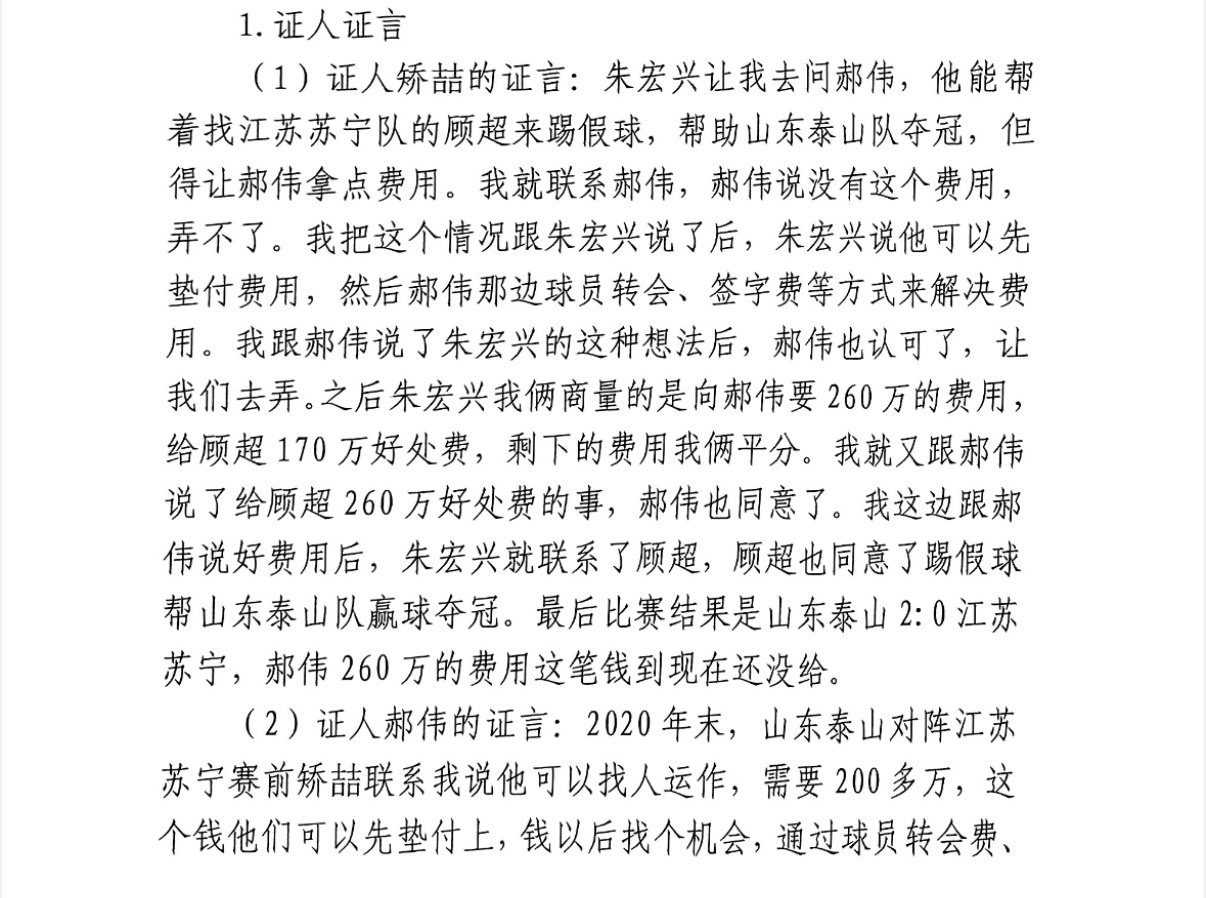 矯喆的證言:朱宏興讓我去問郝偉,他能幫著找江蘇蘇寧隊(duì)的顧超來(lái)踢假球,幫助山東泰山隊(duì)奪冠,但得讓郝偉拿點(diǎn)費(fèi)用。我就聯(lián)系郝偉,郝偉說(shuō)沒有這個(gè)費(fèi)用,弄不了。我把這個(gè)情況跟朱宏興說(shuō)了后,朱宏興說(shuō)他可以先墊付費(fèi)用,然后郝偉那邊球員轉(zhuǎn)會(huì)、簽字費(fèi)等方式來(lái)解決費(fèi)用。我跟郝偉說(shuō)了朱宏興的這種想法后,郝偉也認(rèn)可了,讓我們?nèi)ヅV笾旌昱d我倆商量的是向郝偉要260萬(wàn)的費(fèi)用,給顧超170萬(wàn)好處費(fèi),剩下的費(fèi)用我倆平分。我就又跟郝偉說(shuō)了給顧超260萬(wàn)好處費(fèi)的事,郝偉也同意了。我這邊跟郝偉說(shuō)好費(fèi)用后,朱宏興就聯(lián)系了顧超,顧超也同意了踢假球幫山東泰山隊(duì)贏球奪冠。最后比賽結(jié)果是山東泰山2:0江蘇蘇寧,郝偉260萬(wàn)的費(fèi)用這筆錢到現(xiàn)在還沒給。
