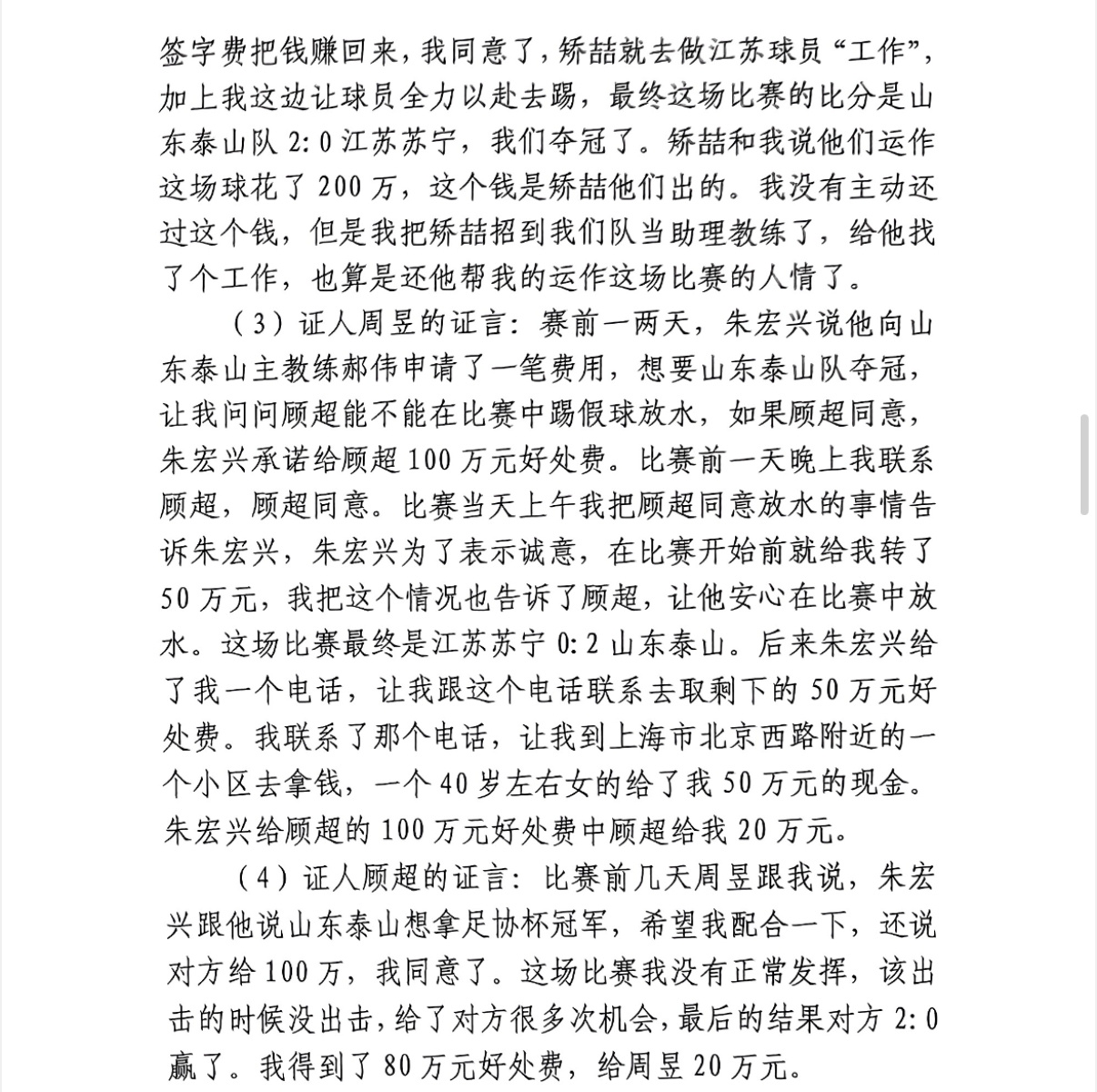 周昱的證言:賽前一兩天,朱宏興說(shuō)他向山東泰山主教練郝偉申請(qǐng)了一筆費(fèi)用,想要山東泰山隊(duì)奪冠,讓我問問顧超能不能在比賽中踢假球放水,如果顧超同意,朱宏興承諾給顧超100萬(wàn)元好處費(fèi)。比賽前一天晚上我聯(lián)系顧超,顧超同意。比賽當(dāng)天上午我把顧超同意放水的事情告訴朱宏興,朱宏興為了表示誠(chéng)意,在比賽開始前就給我轉(zhuǎn)了50萬(wàn)元,我把這個(gè)情況也告訴了顧超,讓他安心在比賽中放水。這場(chǎng)比賽最終是江蘇蘇寧0:2山東泰山。后來(lái)朱宏興給了我一個(gè)電話,讓我跟這個(gè)電話聯(lián)系去取剩下的50萬(wàn)元好處費(fèi)。我聯(lián)系了那個(gè)電話,讓我到上海市北京西路附近的一個(gè)小區(qū)去拿錢,一個(gè)40歲左右女的給了我50萬(wàn)元的現(xiàn)金。朱宏興給顧超的100萬(wàn)元好處費(fèi)中顧超給我20萬(wàn)元。
