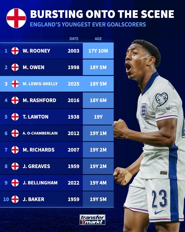 18歲5個月!斯凱利是英格蘭隊史第3年輕進(jìn)球者,僅次魯尼&歐文