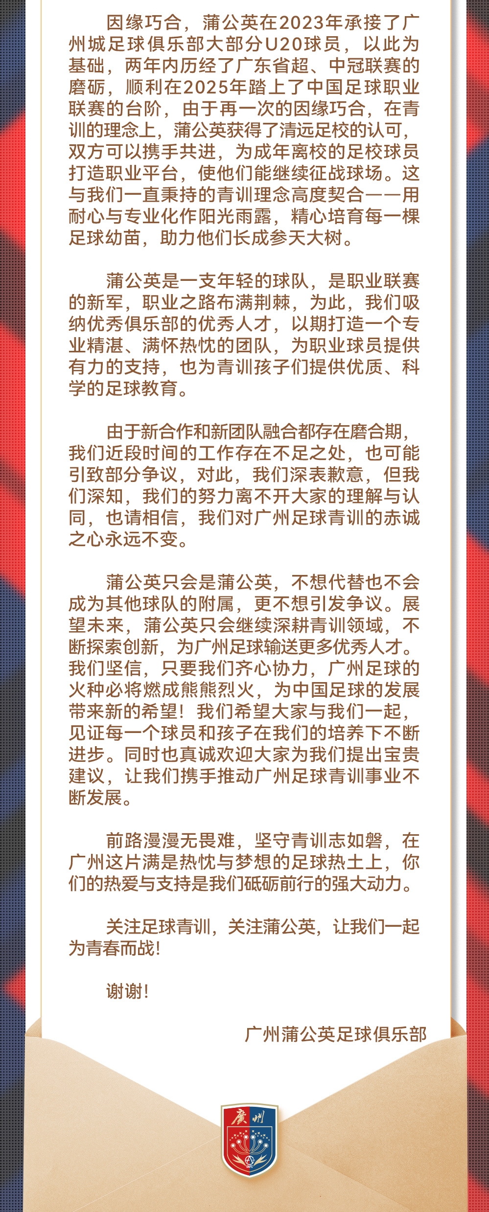 蒲公英只會是蒲公英,不想代替也不會成為其他球隊的附屬,更不想引發(fā)爭議。展望未來,蒲公英只會繼續(xù)深耕青訓(xùn)領(lǐng)域,不斷探索創(chuàng)新,為廣州足球輸送更多優(yōu)秀人才。我們堅信,只要我們齊心協(xié)力,廣州足球的火種必將燃成熊熊烈火,為中國足球的發(fā)展帶來新的希望!我們希望大家與我們一起,見證每一個球員和孩子在我們的培養(yǎng)下不斷進(jìn)步,同時也真誠歡迎大家為我們提出寶貴建議,讓我們攜手推動廣州足球青訓(xùn)事業(yè)不斷發(fā)展。