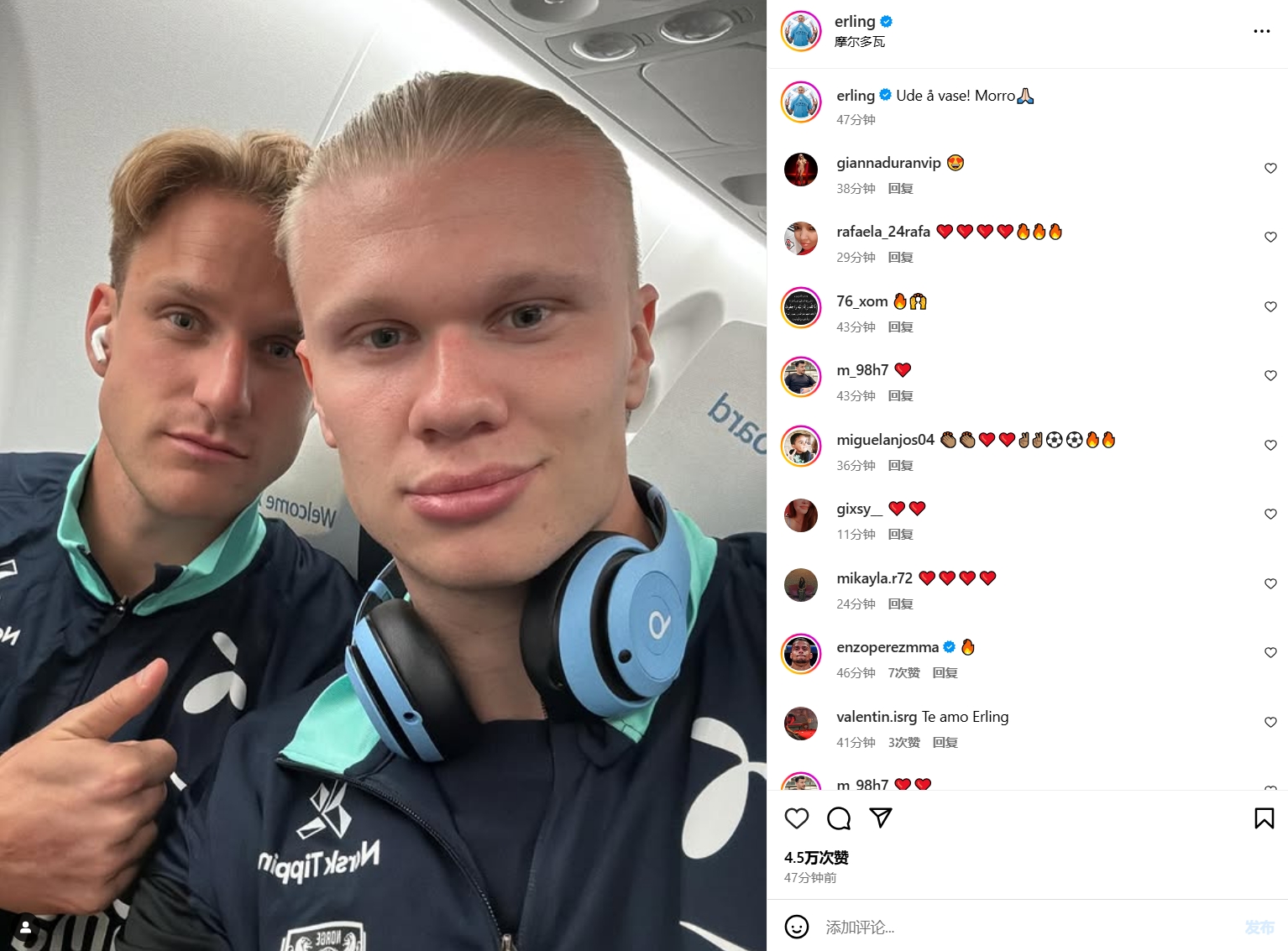 哈蘭德更新社媒動態(tài),曬出與國家隊隊友博特海姆的合照,配文:“出去瞎逛,有趣?!?/p>