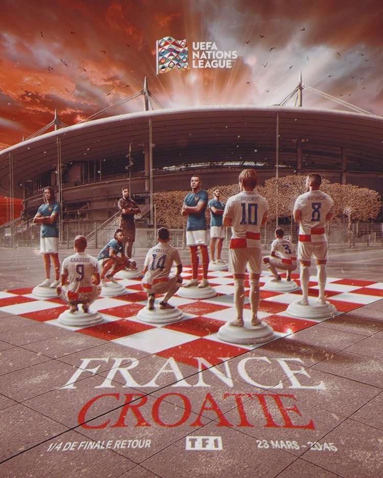 法國隊(duì)官方社媒發(fā)布了為次回合制作的海報(bào),內(nèi)容為兩隊(duì)球員在球場外的棋盤上對(duì)峙,姆巴佩、莫德里奇領(lǐng)銜出鏡。