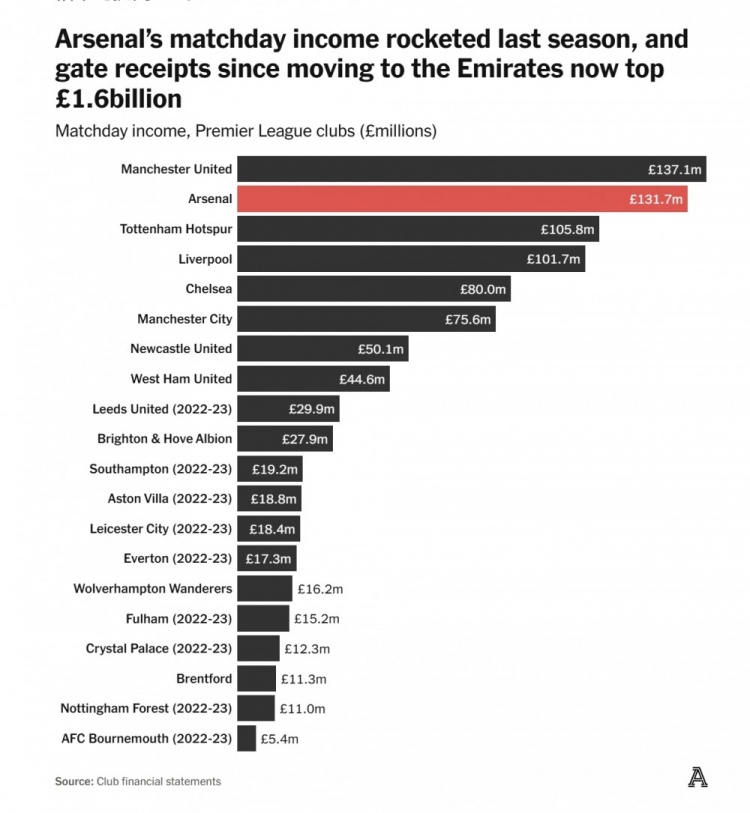 阿森納比賽日收入飆升,自遷入酋長(zhǎng)球場(chǎng)以來(lái),收入已超過(guò)16億英鎊