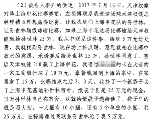 被告人秦升的供述:2017年1月16日,天津權(quán)健對陣上海申花比賽賽前,左祿博聯(lián)系我說這場球天津權(quán)健總經(jīng)理褚玉輝想贏得比賽,讓我找我們上海申花隊的孫世林,讓孫世林踢假球輸比賽,如果上海申花這場比賽輸給天津權(quán)健就給孫世林25萬,我從中聯(lián)系這件事,給我5萬元好處費,我就找到孫世林,說在場上松點踢,意思就是在比賽中放水的意思,承諾賽后給孫世林25萬,孫世林同意了,賽后天津權(quán)健3:0贏了上海申花,我通過的XXX卡在大連的一家工商銀行取了10萬元,拿著錢回到上海的家中,在家里拿了15萬,比賽結(jié)束之后2、3天,我拎了一個紙袋子去了上海申花基地孫世林宿舍,紙袋子里是25萬元的現(xiàn)金,當時孫世林自己在宿舍,我就給紙袋子遞給他了。袋子里的錢是兩大捆,一大捆有10小捆,還有5個單獨的小捆,共25萬元。左祿博通過我聯(lián)系孫世林給了我5萬元。