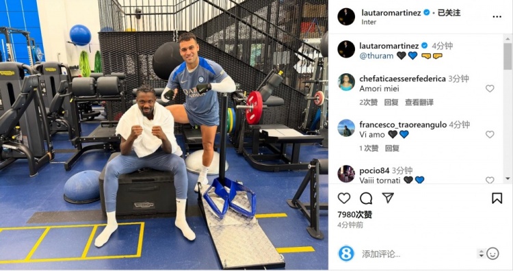 勞塔羅和小圖拉姆都因傷退出國家隊(duì)名單,回到俱樂部恢復(fù)。勞塔羅在社交媒體上曬出與小圖拉姆在健身房內(nèi)的合照,并配上了藍(lán)黑之心和碰拳的表情符號(hào)。