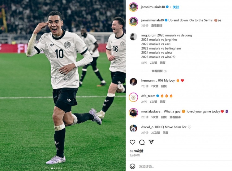 角球偷襲得手!穆西亞拉社媒曬照:有起有伏,晉級歐國聯(lián)四強!