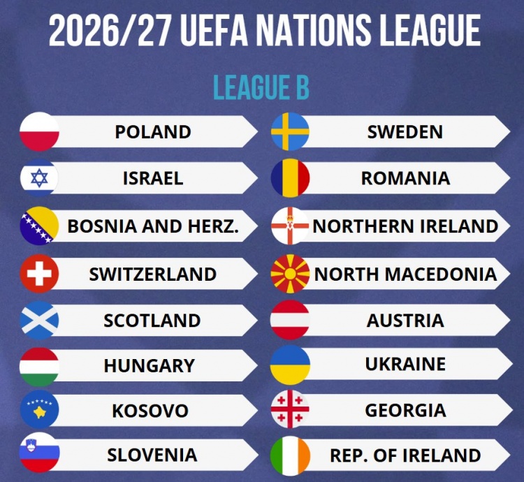 歐國聯2026-27賽季B級別球隊出爐:蘇格蘭、烏克蘭、波蘭在列