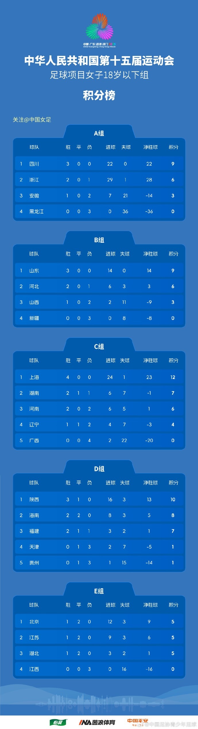 全運(yùn)會(huì)女足U18資格賽(CD組)第5輪、(ABE組)第3輪賽果+積分榜