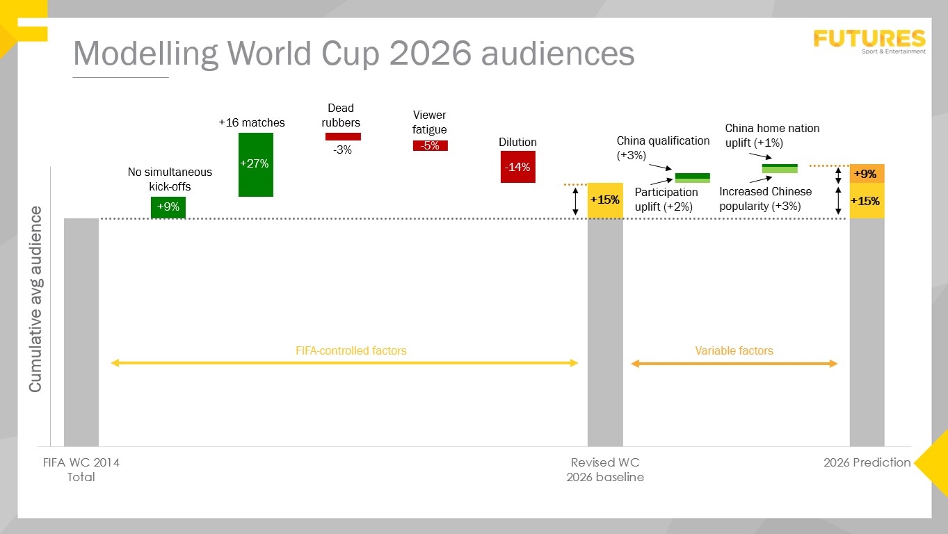 我們對16支擴軍球隊進行了推測。主要受益者將是亞洲和非洲國家;這兩個大洲足聯(lián)在2026年可能各自擁有9支代表隊(相比2014年分別僅有4支和5支)。在此條件下參加世界杯賽事,預計可使相關市場的收視率提升約20%,其中可能包括一些未參加過2014年巴西世界杯的人口大國,如埃及(非洲足聯(lián))和土耳其(歐洲足聯(lián))。然而,迄今為止對全球收視率影響最大的變量將是中國是否晉級。中國晉級帶來的收視提升效應,將超過其余任何15支新晉球隊組合的總和。15支球隊的市場僅使我們預測的2026年總收視率增長2%,而單單中國晉級即可帶來額外3%的增長。