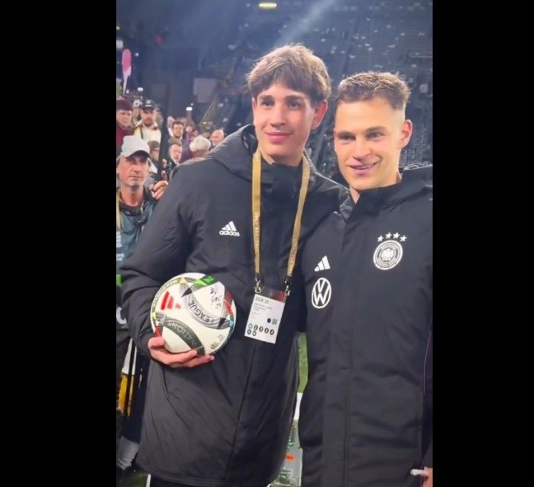 值得一提的是,現場的德國球童第一時間將足球拋給基米希,在很大程度上幫助實現了這一進球?;紫R苍谫惡笳业竭@位球童,為其送上簽名足球并合影鼓勵。