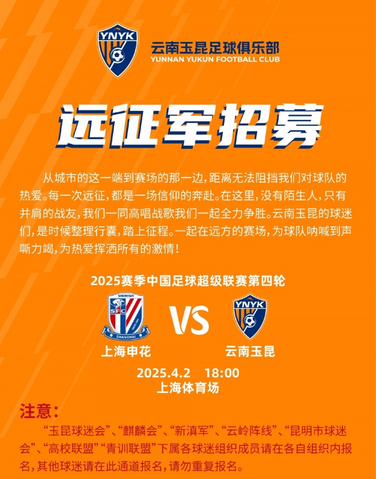 中超第4輪云南玉昆將客場(chǎng)挑戰(zhàn)上海申花,球迷遠(yuǎn)征報(bào)名已正式開(kāi)啟