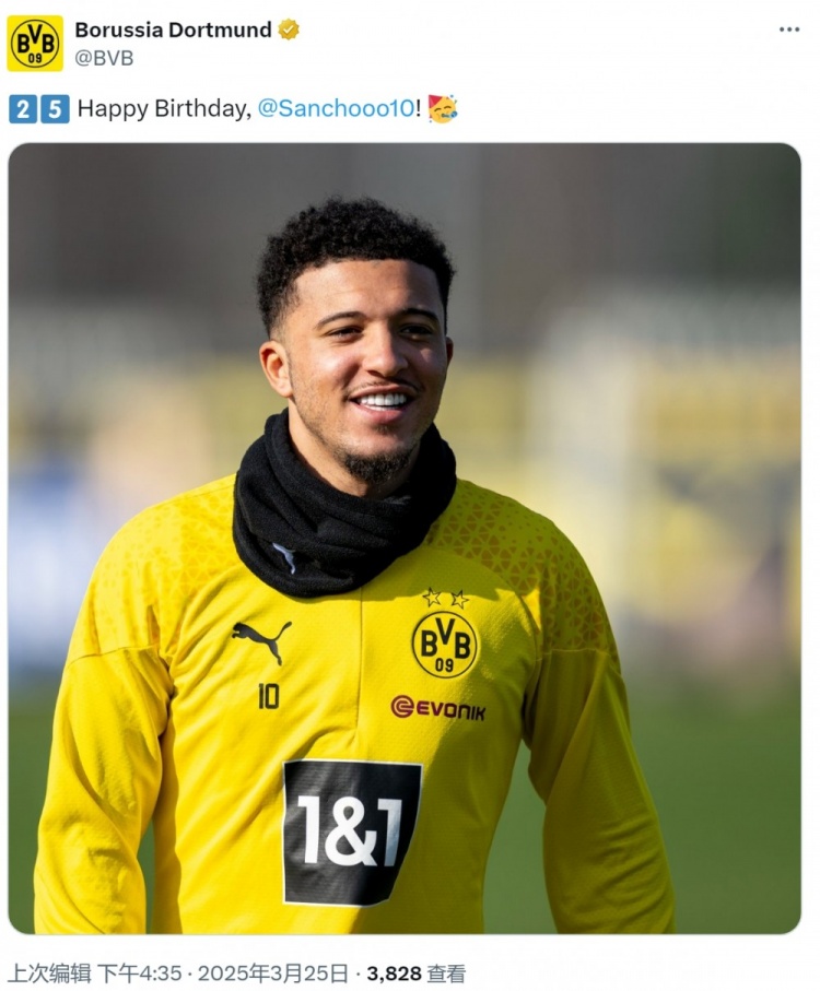 多特官方社媒曬出桑喬效力球隊(duì)時(shí)期的照片,并配文:“祝你25歲生日快樂(lè),桑喬!”