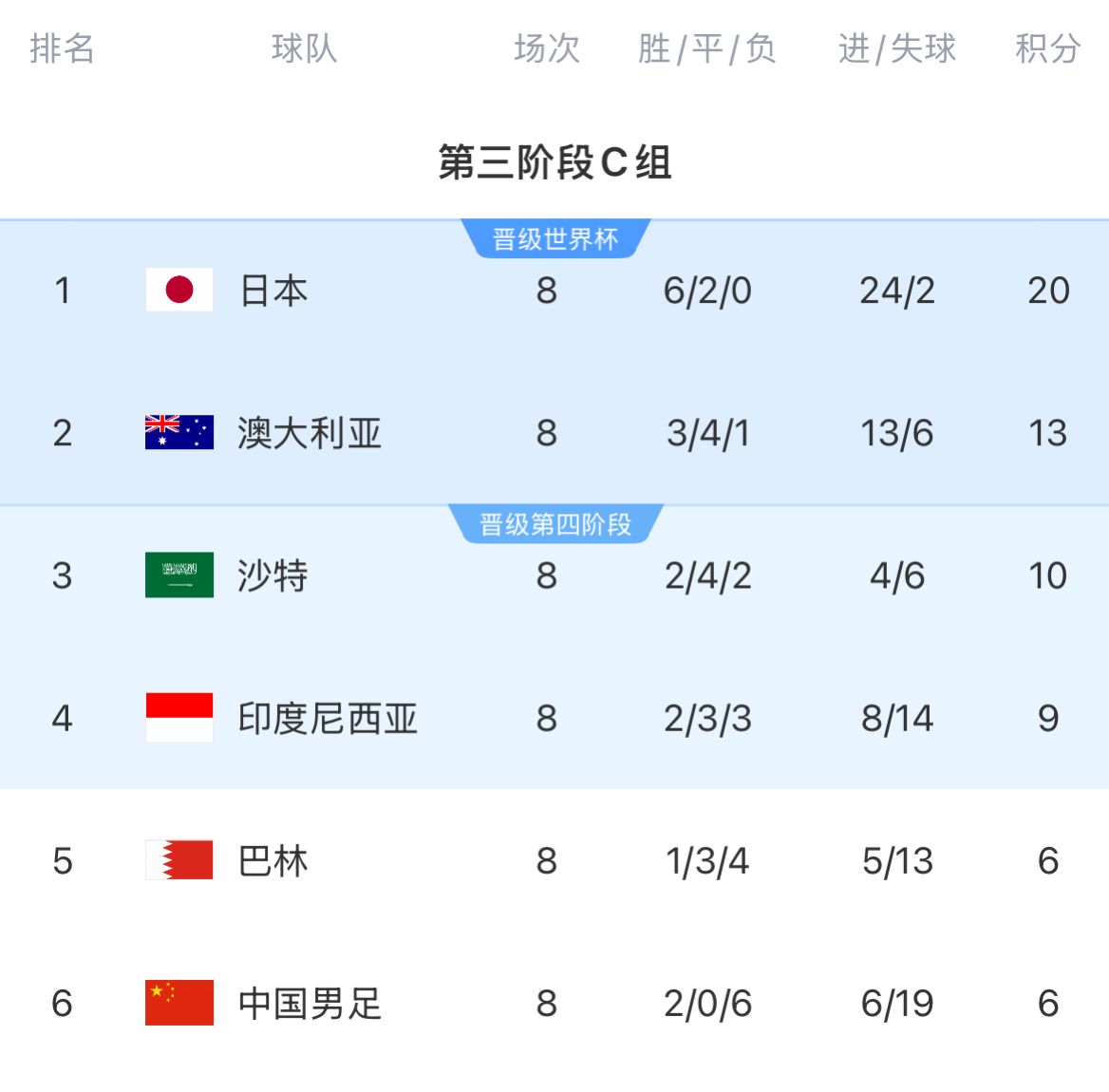 18強(qiáng)賽積分榜:中國巴林6分倒一倒二 印尼9分位居第4 沙特10分第3