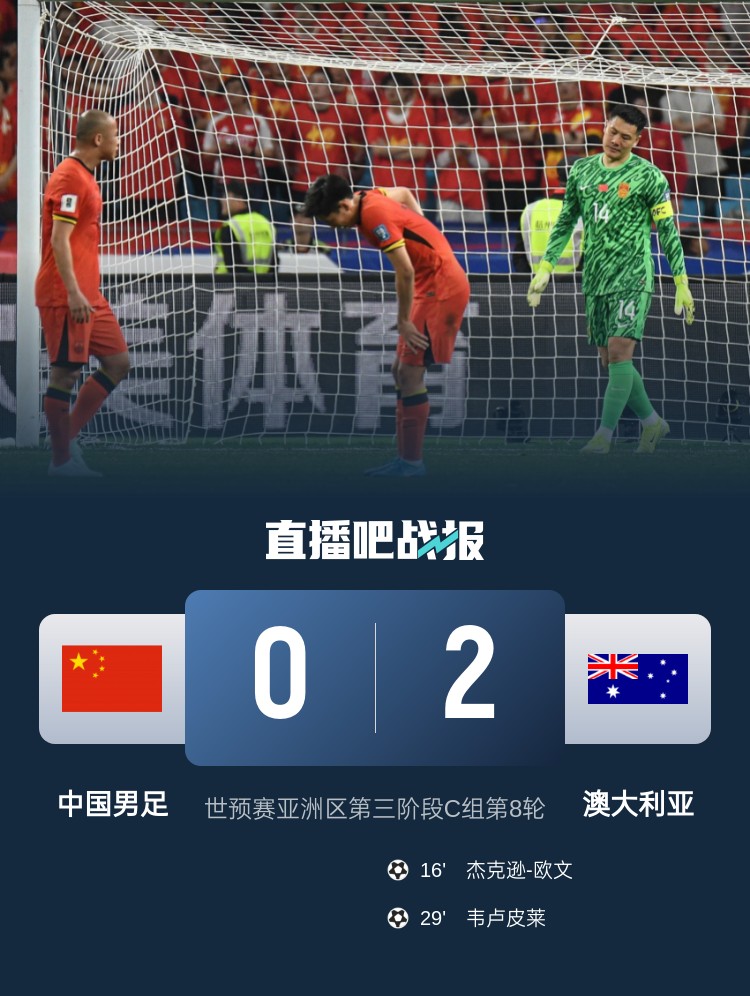 3月25日訊 18強(qiáng)賽C組第8輪,國足主場0-2不敵澳大利亞,遭遇3連敗,8輪積6分繼續(xù)墊底,無緣直通美加墨世界杯。