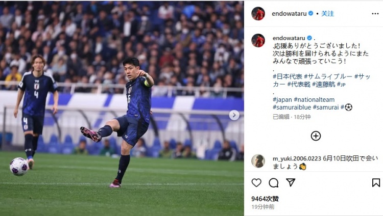 遠(yuǎn)藤航社媒寫道:感謝大家的支持!下場讓我們一起努力,迎接勝利。