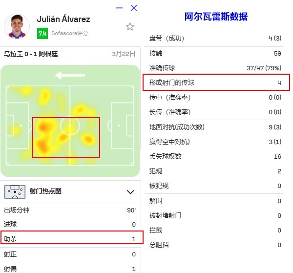 從統(tǒng)計(jì)數(shù)據(jù)可以看到,阿爾瓦雷斯全場(chǎng)只射門1次,卻送出4次關(guān)鍵傳球,最終帶來一記決定勝負(fù)的助攻。