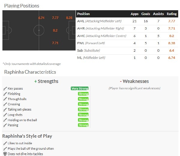 拉菲尼亞本賽季在巴薩的表現(xiàn)非常出色,甚至被視為金球獎(jiǎng)最熱門的候選人之一。問題是,他在巴薩踢得好,是因?yàn)楸划?dāng)做攻城拔寨的前鋒來使用。