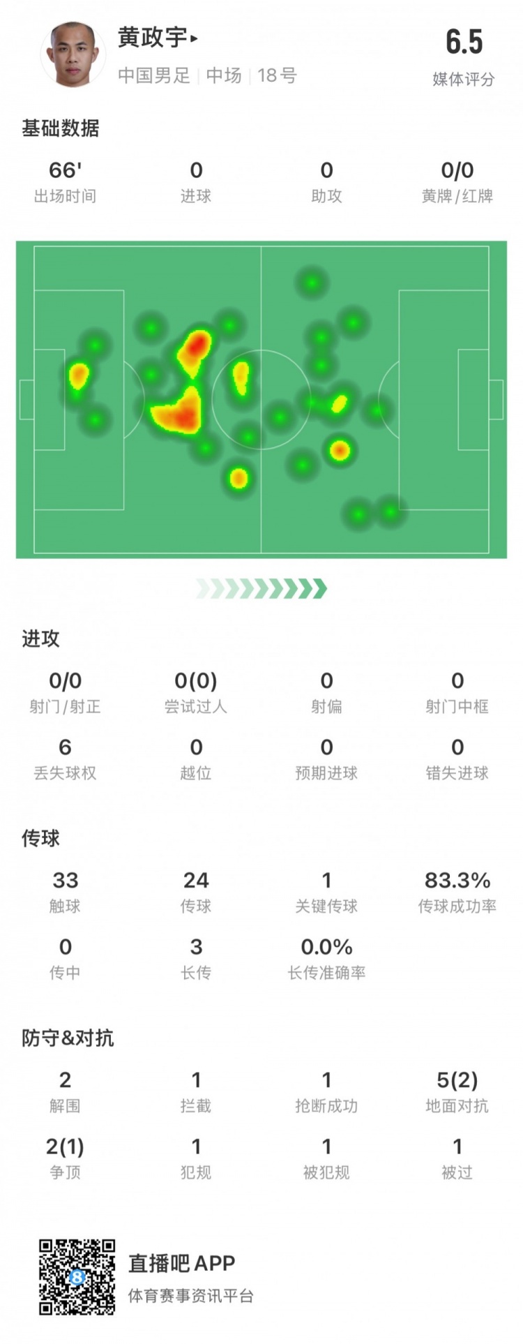 黃政宇數(shù)據(jù):出場66分鐘,地面對抗5次成功2次,關(guān)鍵傳球1次