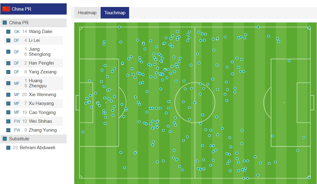 03月25日訊 世預(yù)賽亞洲區(qū)第三階段C組第8輪,中國(guó)vs澳大利亞。比賽上半場(chǎng)國(guó)足在主場(chǎng)陷入全面被動(dòng),根據(jù)觸球統(tǒng)計(jì)圖顯示,國(guó)足半場(chǎng)只在澳大利亞禁區(qū)內(nèi)觸球3次,熱區(qū)圖顯示國(guó)足很難壓過(guò)半場(chǎng)。