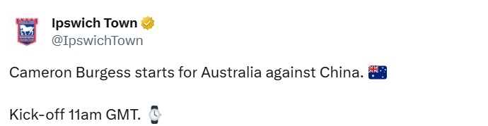 伊普斯維奇社媒:卡梅倫·伯吉斯首發(fā)代表澳大利亞隊對陣中國隊。格林威治時間上午11點開球。