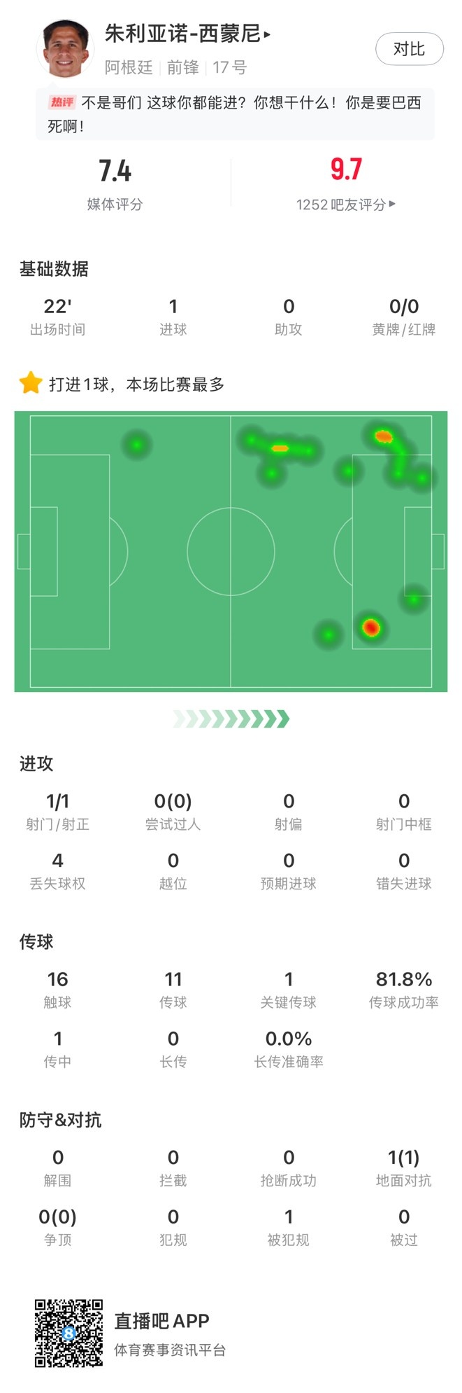 出場時(shí)間22分鐘,進(jìn)球1個(gè)
