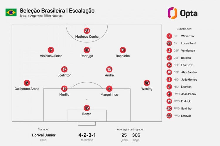 巴西公布了此役的首發(fā)陣容,Opta指出,巴西隊(duì)先發(fā)陣容中超過(guò)一半的球員在國(guó)家隊(duì)的首發(fā)次數(shù)不超過(guò)5次,分別是安德烈(5)、庫(kù)尼亞(3)、本托(2)、喬林頓(2)、穆里略(0)、韋斯利(0)。