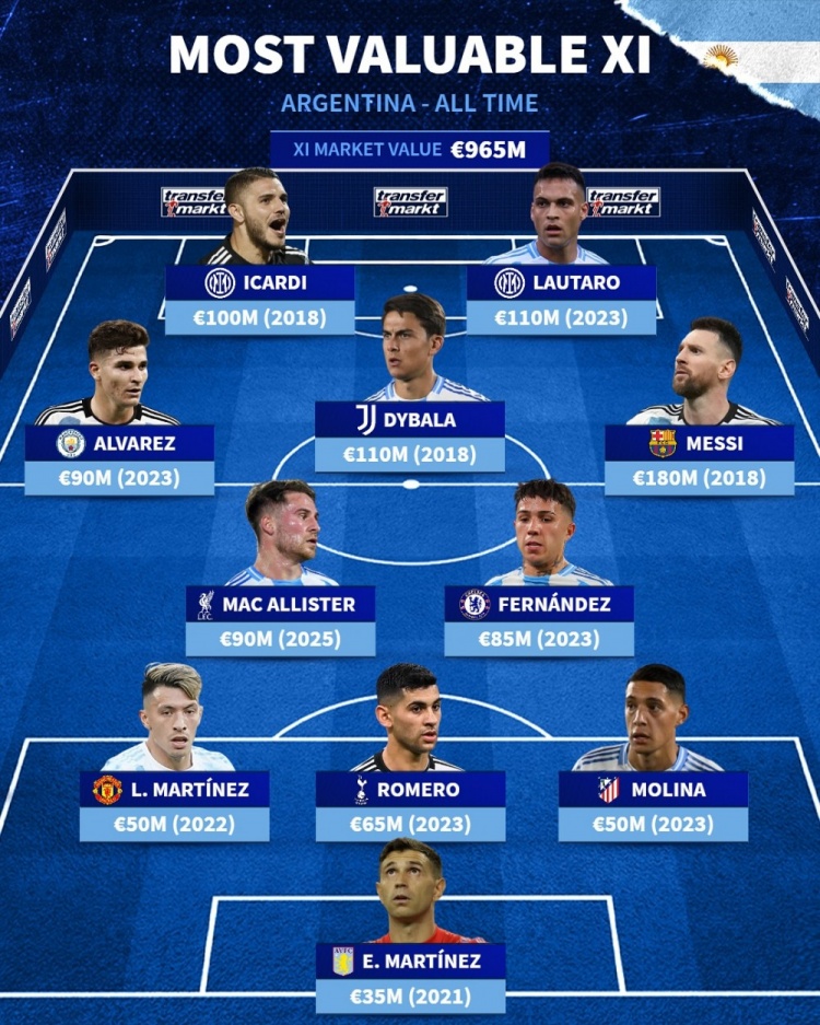 中場/邊鋒:麥卡利斯特(9000萬歐)、恩佐(8500萬歐)、阿爾瓦雷斯(9000萬歐)、迪巴拉(1.1億歐)、梅西(1.8億歐)