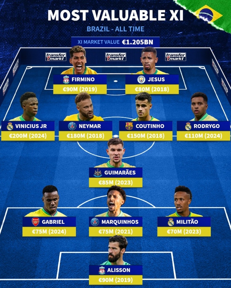 巴西歷史德轉(zhuǎn)身價(jià)最高陣:內(nèi)馬爾、維尼修斯在列,總價(jià)12億歐