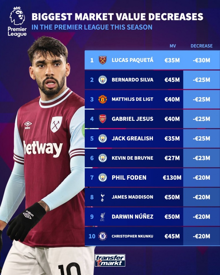 本賽季英超身價(jià)下跌榜:帕奎塔3000萬(wàn)歐,B席、德里赫特2500萬(wàn)歐