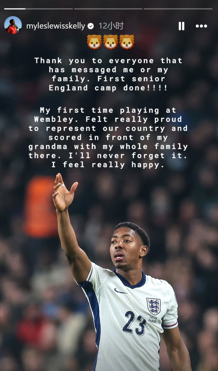 斯凱利寫道:“感謝所有為我和我的家人送上問候的人,首次英格蘭一線隊之旅結(jié)束了?。?!這是我第一次在溫布利球場踢球。能為國出戰(zhàn),并在奶奶和全家面前進(jìn)球,我倍感驕傲。我永遠(yuǎn)不會忘記,也感到非常開心?!?/p>