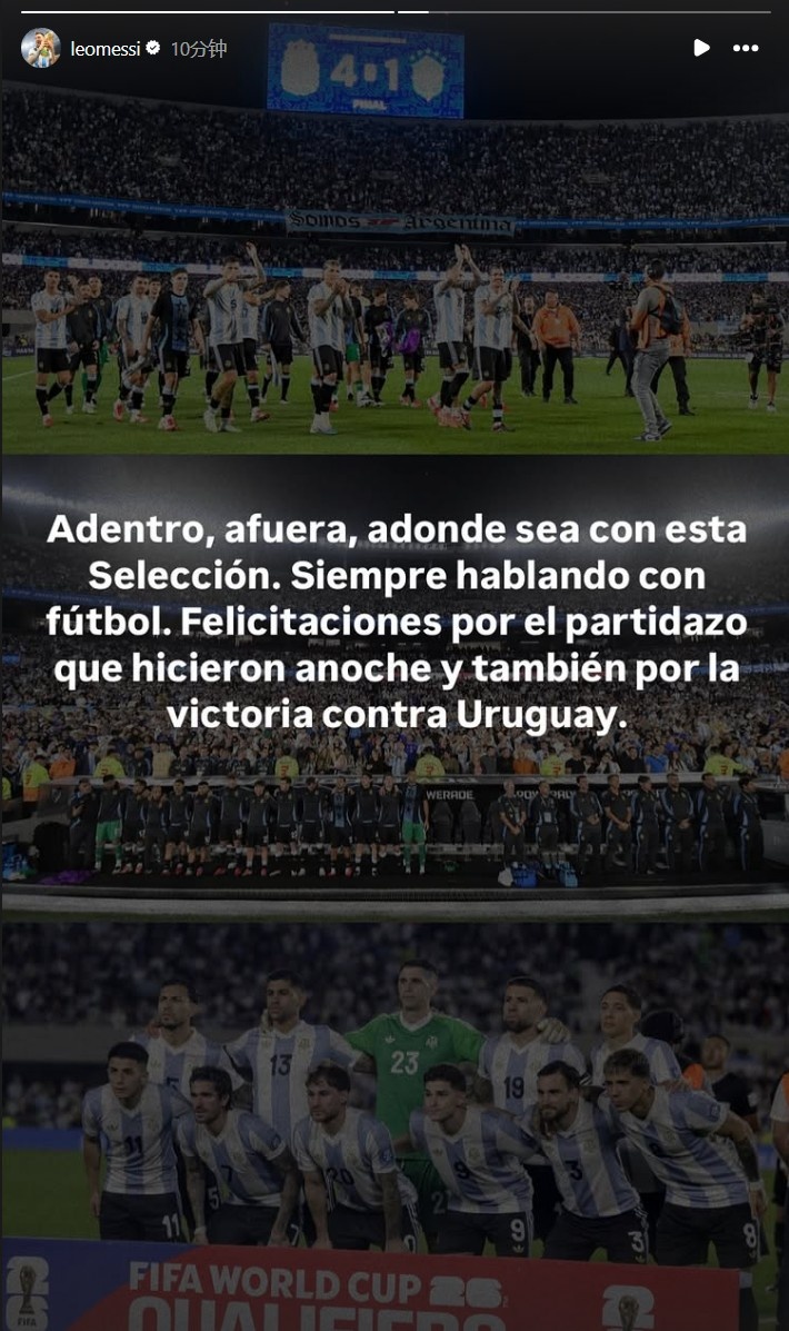 3月26日訊 梅西今天在Instagram發(fā)文,恭喜阿根廷隊擊敗了巴西。