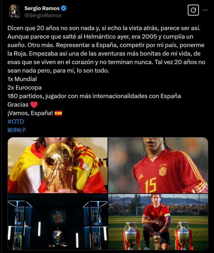 都說(shuō)20年不算什么,當(dāng)我回首往事時(shí),似乎確實(shí)如此。盡管感覺就像我昨天才踏上赫爾曼蒂科球場(chǎng),但那其實(shí)是在2005年,那天我實(shí)現(xiàn)了夢(mèng)想,即代表西班牙,為我的國(guó)家而戰(zhàn)!就這樣,我開啟了一段人生中最美好的經(jīng)歷之一,這段經(jīng)歷會(huì)刻在我心底、永遠(yuǎn)不會(huì)遺忘。也許這20年不算什么,但對(duì)我來(lái)說(shuō),這就是一切,它讓我獲得1次世界杯冠軍、2次歐洲杯冠軍,代表西班牙隊(duì)踢了180場(chǎng)比賽,成為為西班牙隊(duì)出場(chǎng)次數(shù)最多的球員!