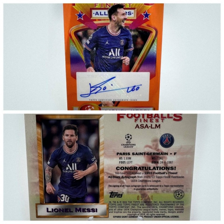 這張2021-22賽季Topps Finest Flashbacks UEFA Champions League Football’s Finest全明星簽名橙折射卡,全球僅印制10張。正面小字標(biāo)注著“Topps認(rèn)證簽名版本”。卡片背面還提供了更多保證:“所有Topps簽名卡的簽署過程均有Topps代表現(xiàn)場監(jiān)督,確保真實性?!边@張卡片潛在價值超過1000美元。