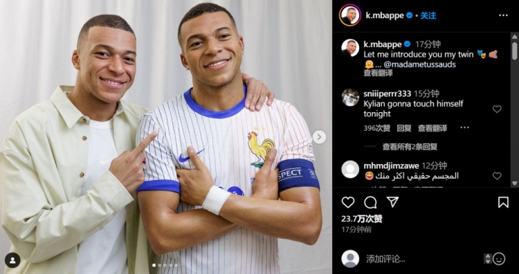 姆巴佩社媒曬與自己蠟像合影:讓我給你介紹一下我的雙胞胎