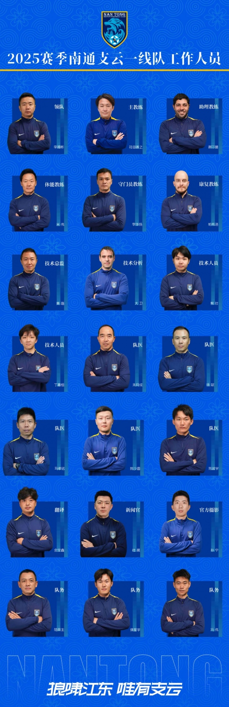 南通支云2025賽季一線隊大名單正式出爐!煥然一新的隊伍,期待與你一道,在綠茵賽場書寫屬于南通的藍(lán)色篇章,攜手完成賽季目標(biāo)。為南通,我們一起戰(zhàn)斗!戰(zhàn)斗!戰(zhàn)斗!