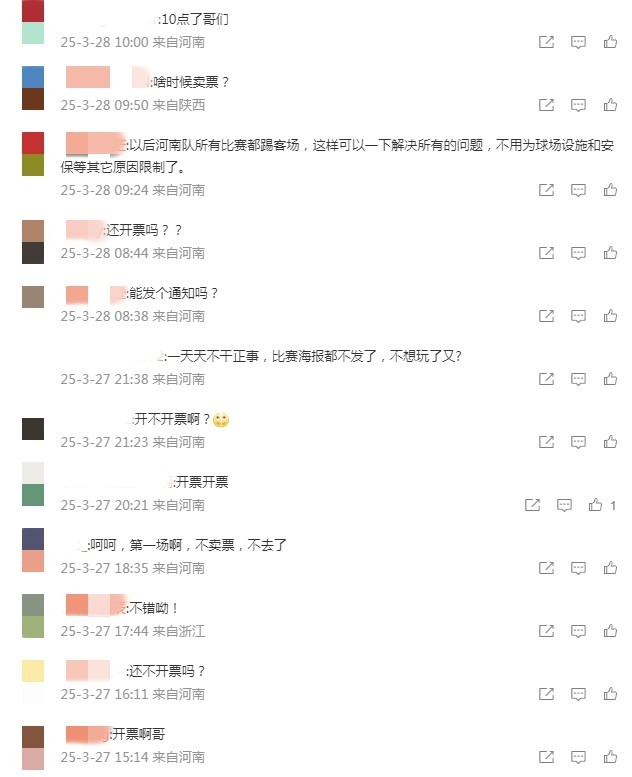 根據(jù)賽程安排,河南隊(duì)將在本輪聯(lián)賽主場(chǎng)對(duì)陣上海申花,比賽時(shí)間為3月29日(星期六)18:00。在賽前僅剩一天的時(shí)候,俱樂部仍未售票,也沒有相關(guān)公告,這讓球迷等得非常急迫。在河南隊(duì)官方微博的評(píng)論區(qū),球迷們?cè)诔掷m(xù)催促售票。