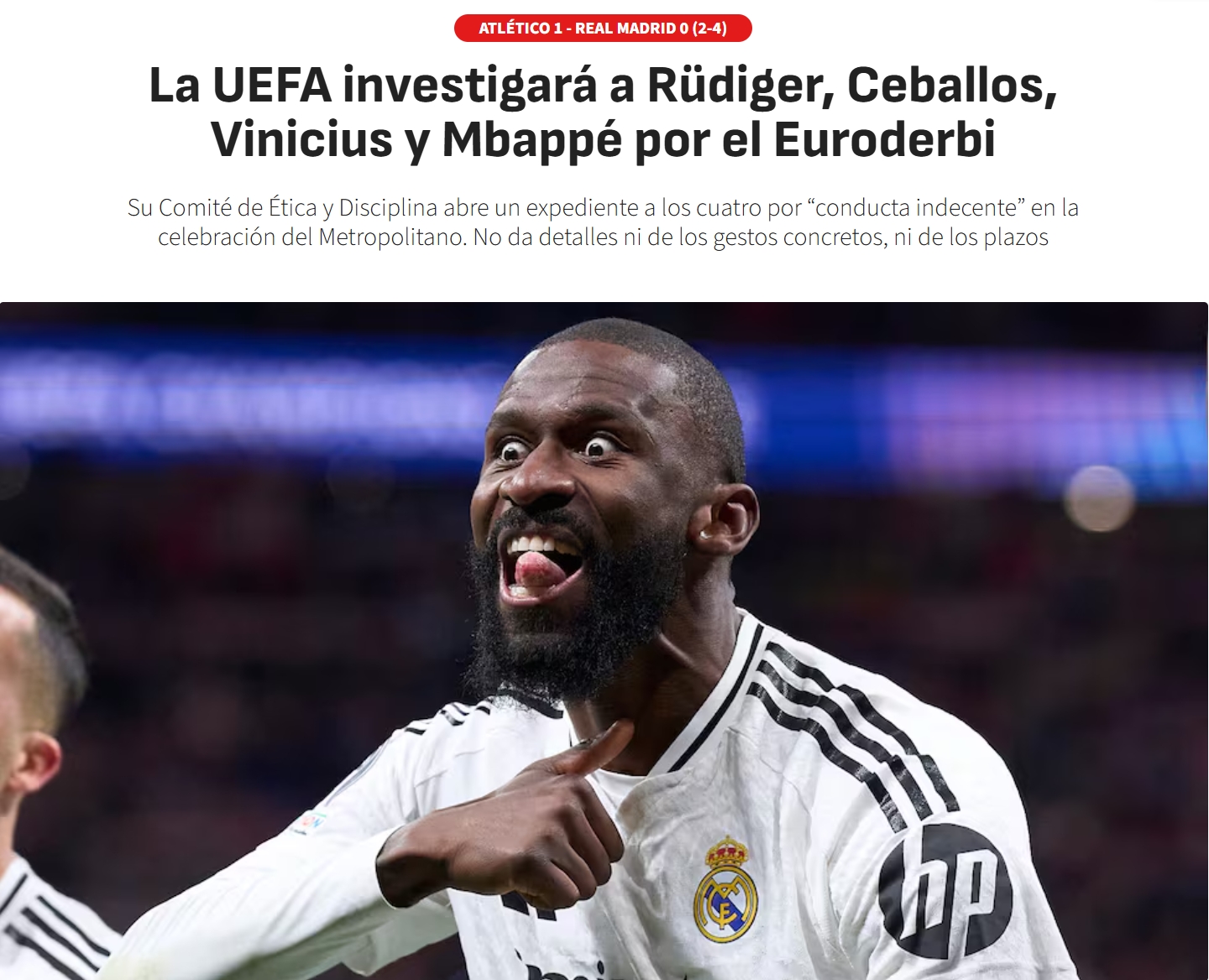 03月28日訊 歐足聯(lián)官方昨日發(fā)布官方公告,宣布對(duì)姆巴佩、維尼修斯、呂迪格、塞巴略斯4名皇馬球員在歐冠對(duì)馬競(jìng)賽后的不當(dāng)行為展開(kāi)進(jìn)一步調(diào)查?!栋⑺箞?bào)》透露了皇馬俱樂(lè)部方面對(duì)此的立場(chǎng)。