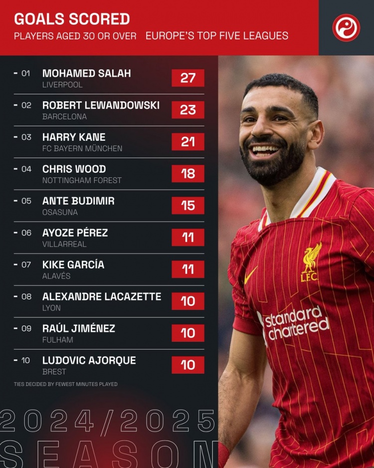 本賽季五大聯(lián)賽僅3名30+球員打進20+聯(lián)賽進球:薩拉赫、萊萬、凱恩