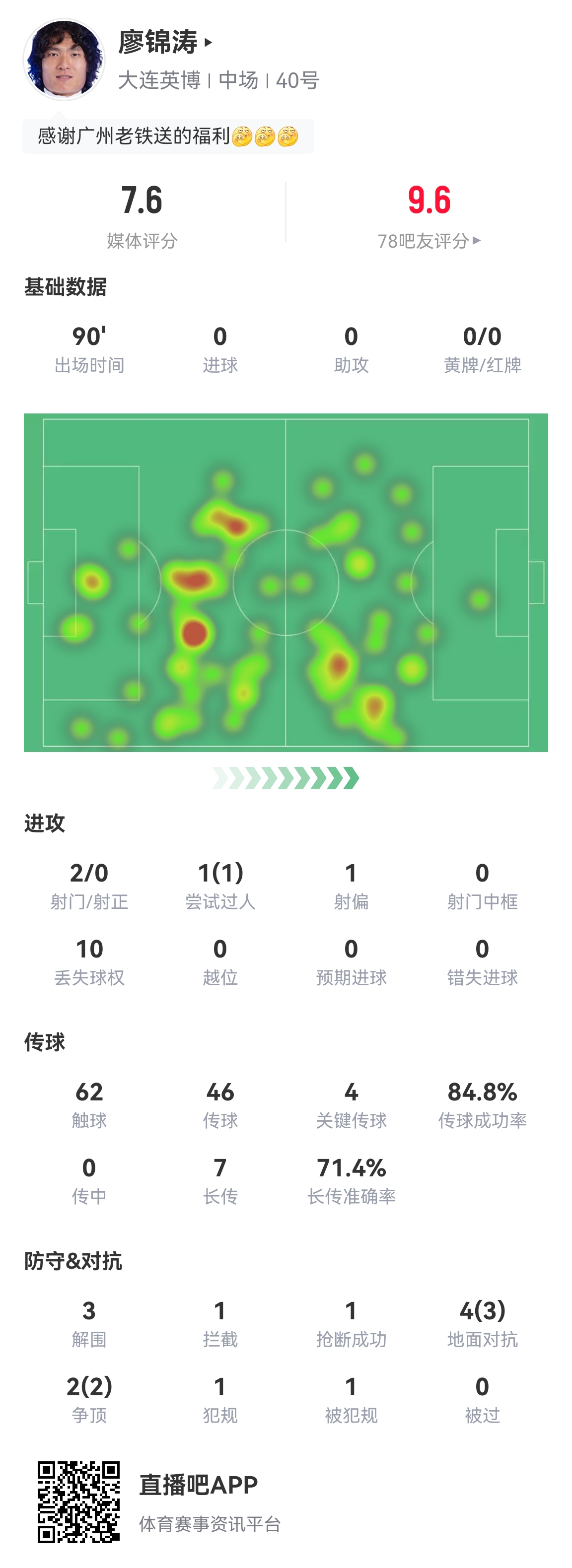 03月29日訊 大連英博2-0完勝長春亞泰,25歲的英博后腰廖錦濤發(fā)揮穩(wěn)健,攻防一體,傳球成功率85%,貢獻1次成功過人和1次射門,防守端3次解圍,2次成功爭頂,4次對抗3次成功,他的發(fā)揮也得到了吧友的稱贊!