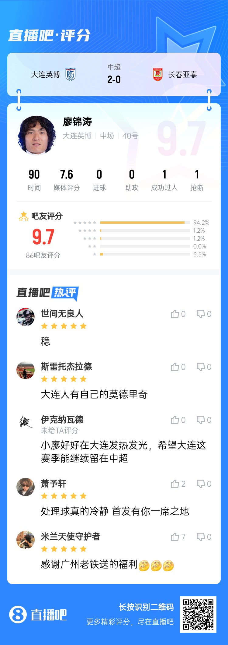 伊萬考慮下?大連英博單后腰廖錦濤攻防一體,吧友打分9.6分!